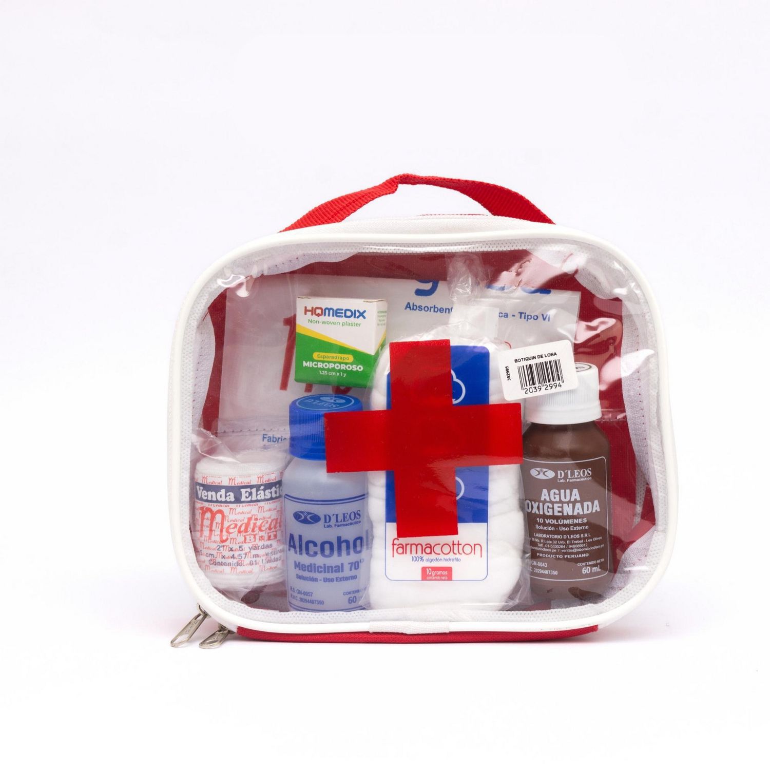 Este botiquín de lona incluye elementos esenciales como alcohol, algodón, agua oxigenada, curitas, esparadrapo, vendas y gasas. Su diseño es ideal para vehículos, asegurando que tengas todo lo necesario para atender pequeñas emergencias. El modelo Básico es perfecto para tenerlo siempre a la mano.