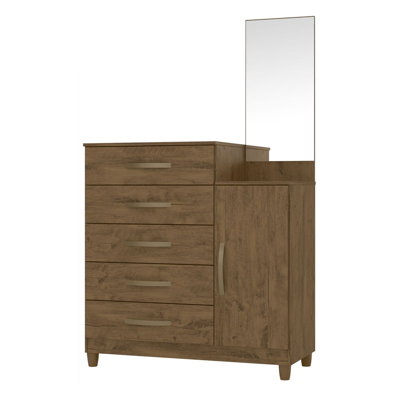 Esta cómoda de la línea Lisboa, con un ancho de 104 cm y una altura de 170 cm, está fabricada en madera y presenta un acabado semibrillante que realza su diseño urbano industrial. Cuenta con cinco cajones para guardar tus cosas y un espejo integrado, ideal para tu día a día. Además, incluye un manual de armado y está diseñada para ser duradera.