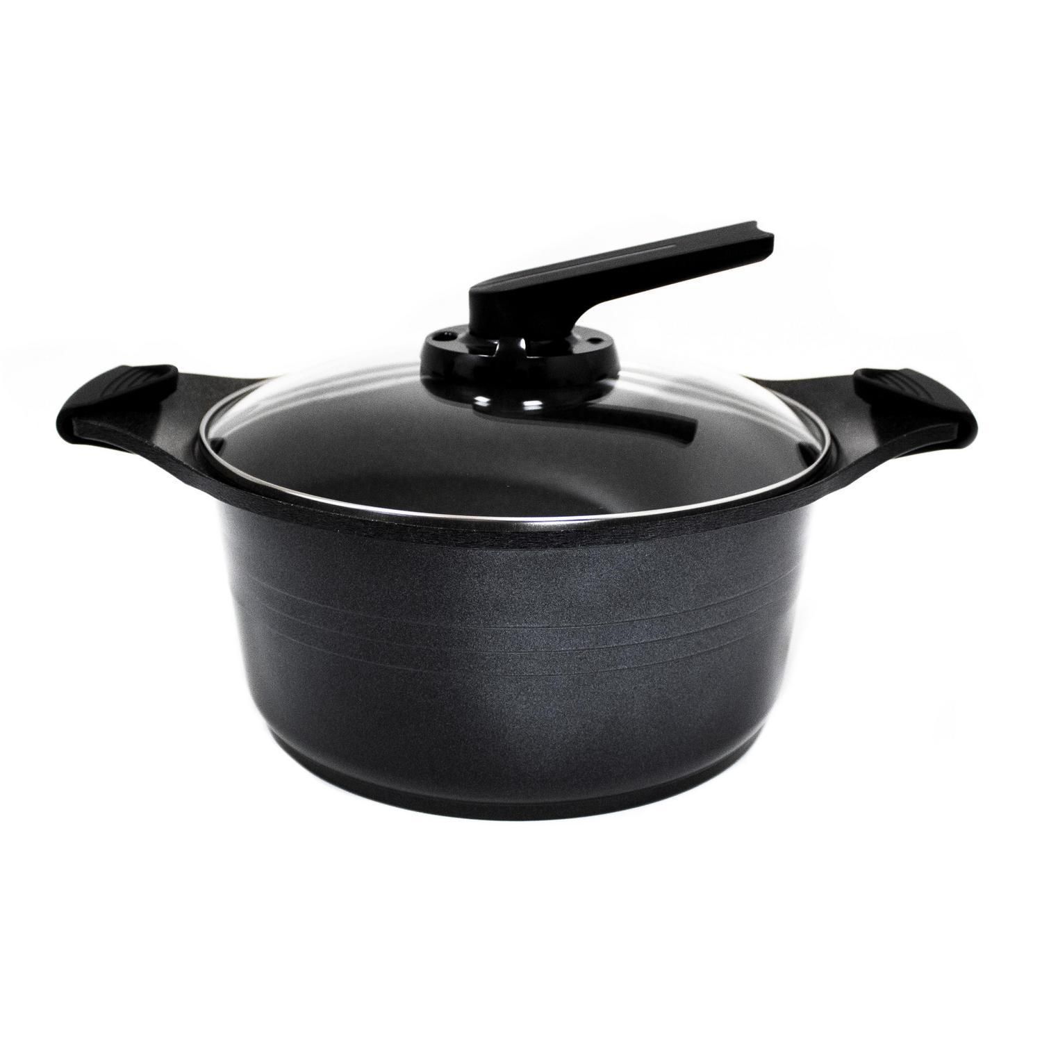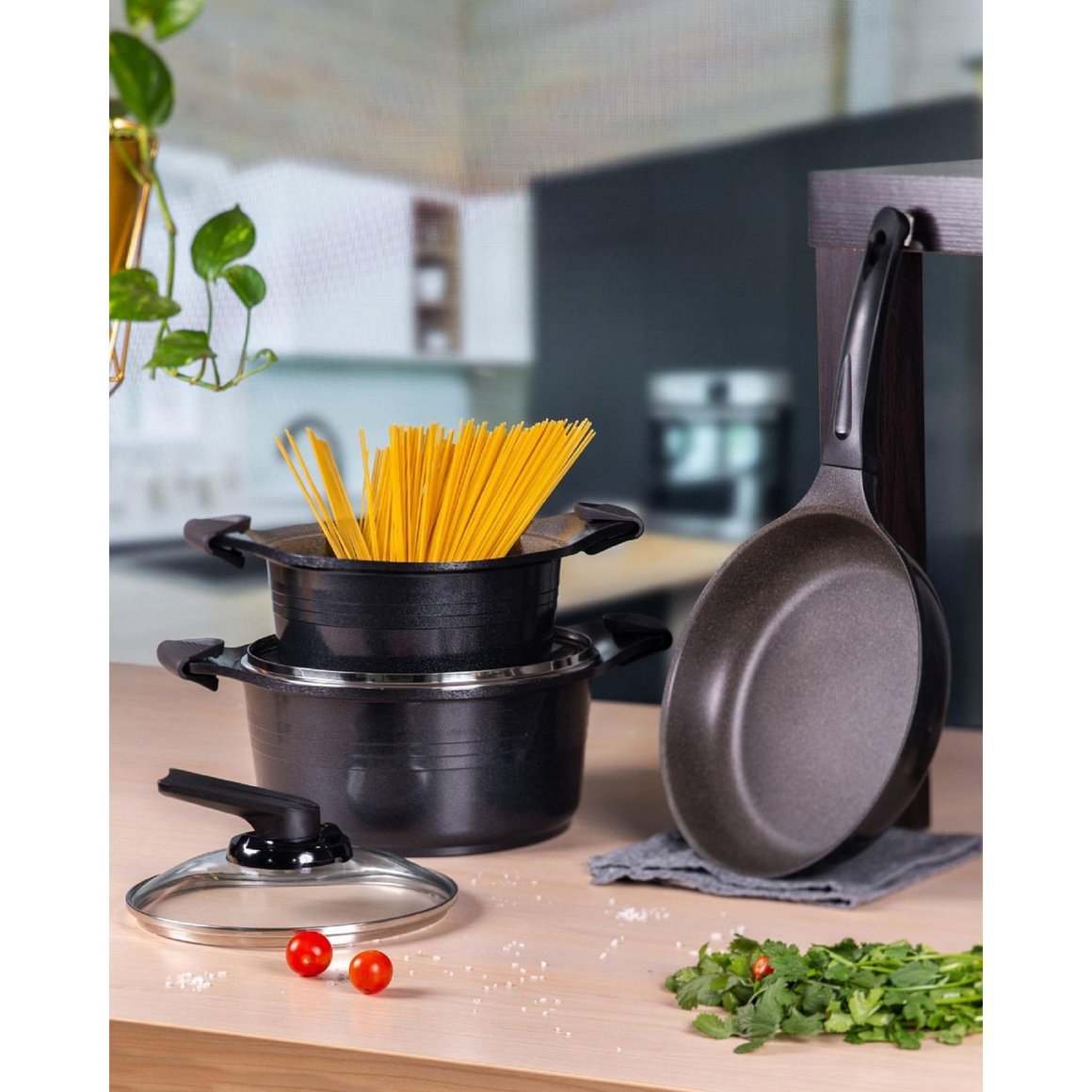 Este juego de ollas está hecho de aluminio fundido con recubrimiento cerámico, lo que lo hace resistente y duradero. Además, es libre de PFOA, PTFE, plomo y cadmio, por lo que es seguro para tu salud. El juego incluye tapas de vidrio para que puedas controlar la cocción de tus alimentos. ¡Prepara tus mejores recetas con este juego de ollas que te ayudará a cocinar como un chef profesional!
