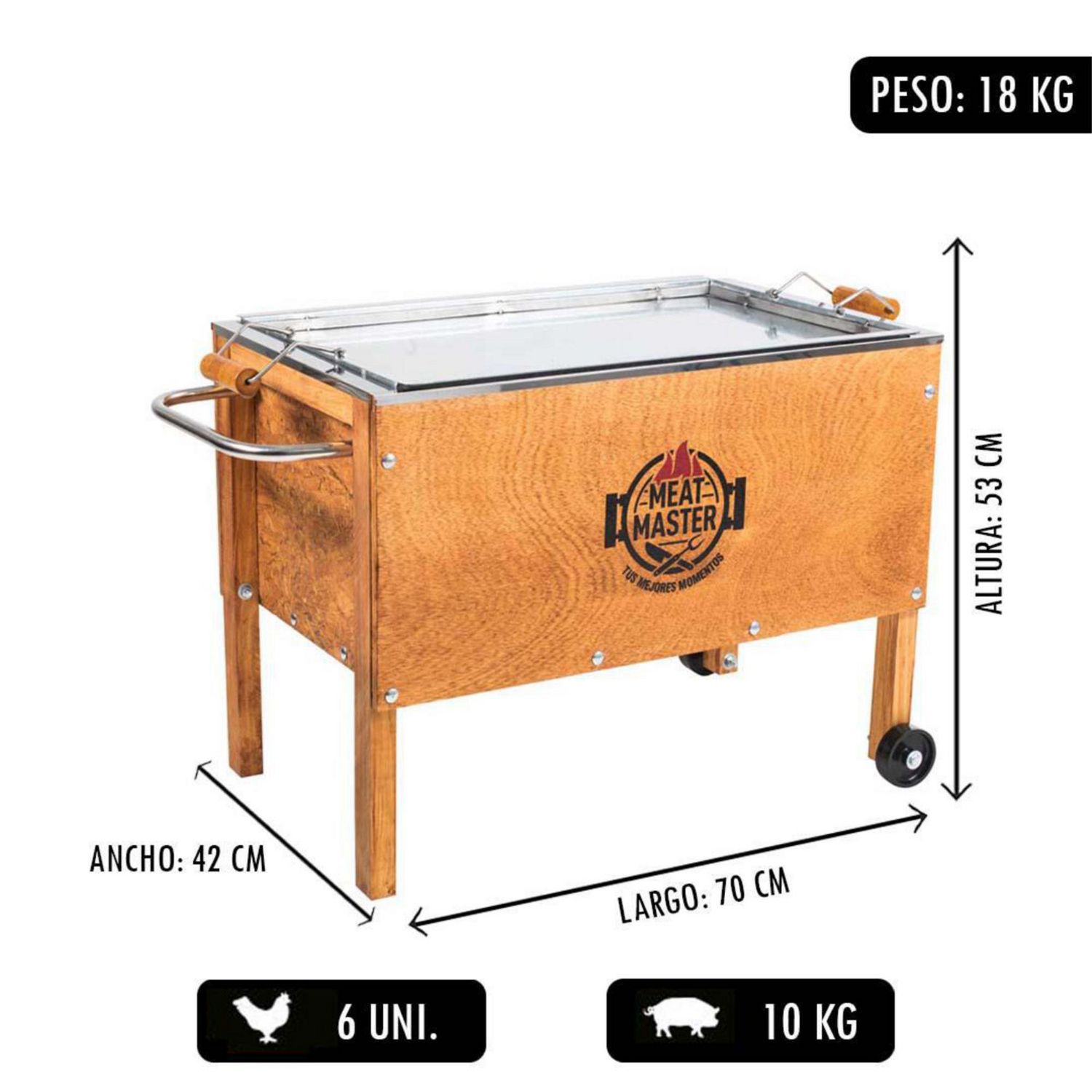 La Caja China Meat Master Mediana Premium es la opción ideal para disfrutar de deliciosas carnes asadas al estilo tradicional. Con su diseño de madera forrada en acero inoxidable, esta caja china te permitirá preparar hasta 6 pollos o 10 kg de carne, ideal para compartir con amigos y familia. Su tamaño mediano de 70x53x40cm la hace perfecta para cualquier espacio, y sus ruedas te permiten moverla con facilidad. Además, cuenta con una bandeja de cocción y de jugos en acero inoxidable, y la tapa tiene mangos de madera para un manipuleo seguro.