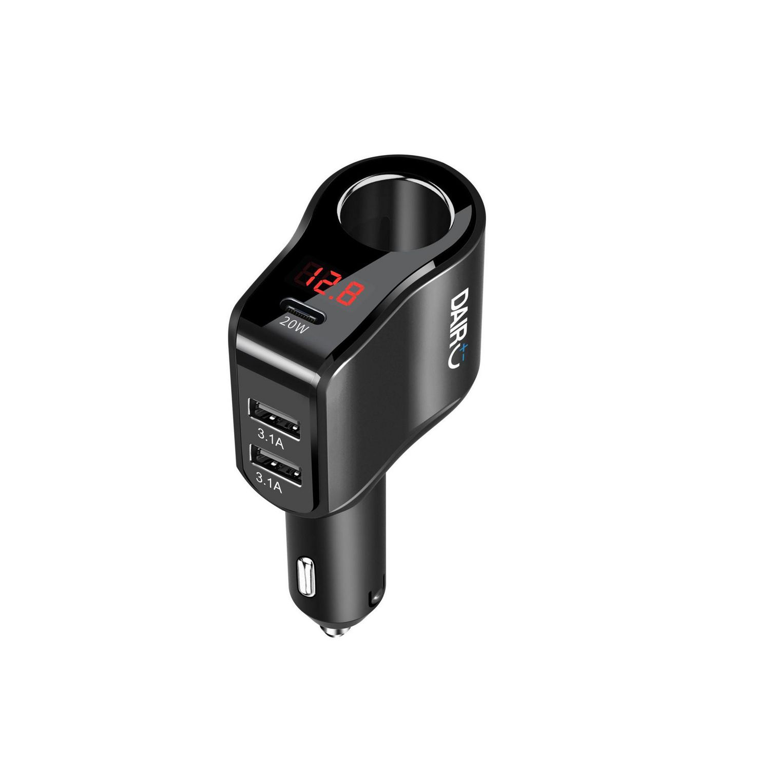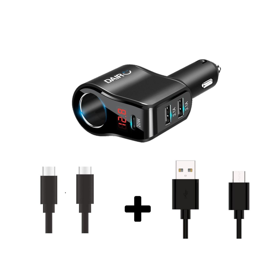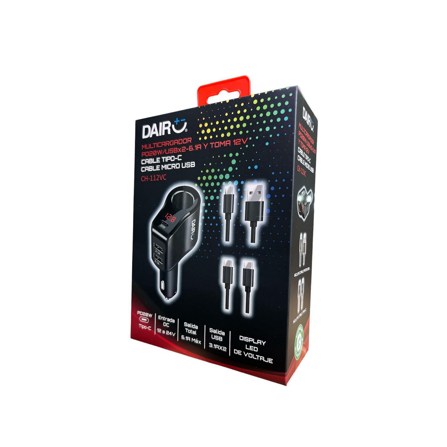 Este cargador Dairu cuenta con múltiples características que lo hacen destacar. Ofrece una entrada de DC 12-24V y una capacidad de carga máxima compartida de 6.1A. Sus salidas incluyen PD20W Tipo-C, USB1 y USB2, con indicadores LED azules y una pantalla LED de voltaje. Además, incluye cables Tipo-C a Tipo-C y Micro USB, brindando aún más versatilidad.