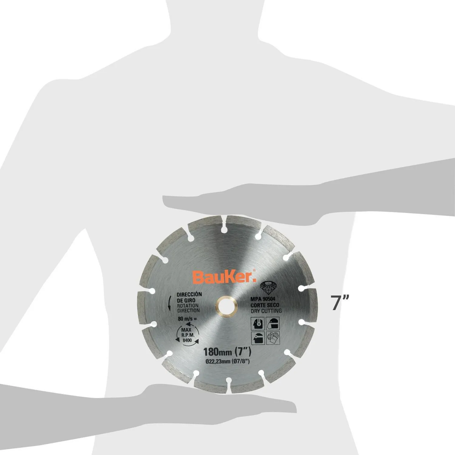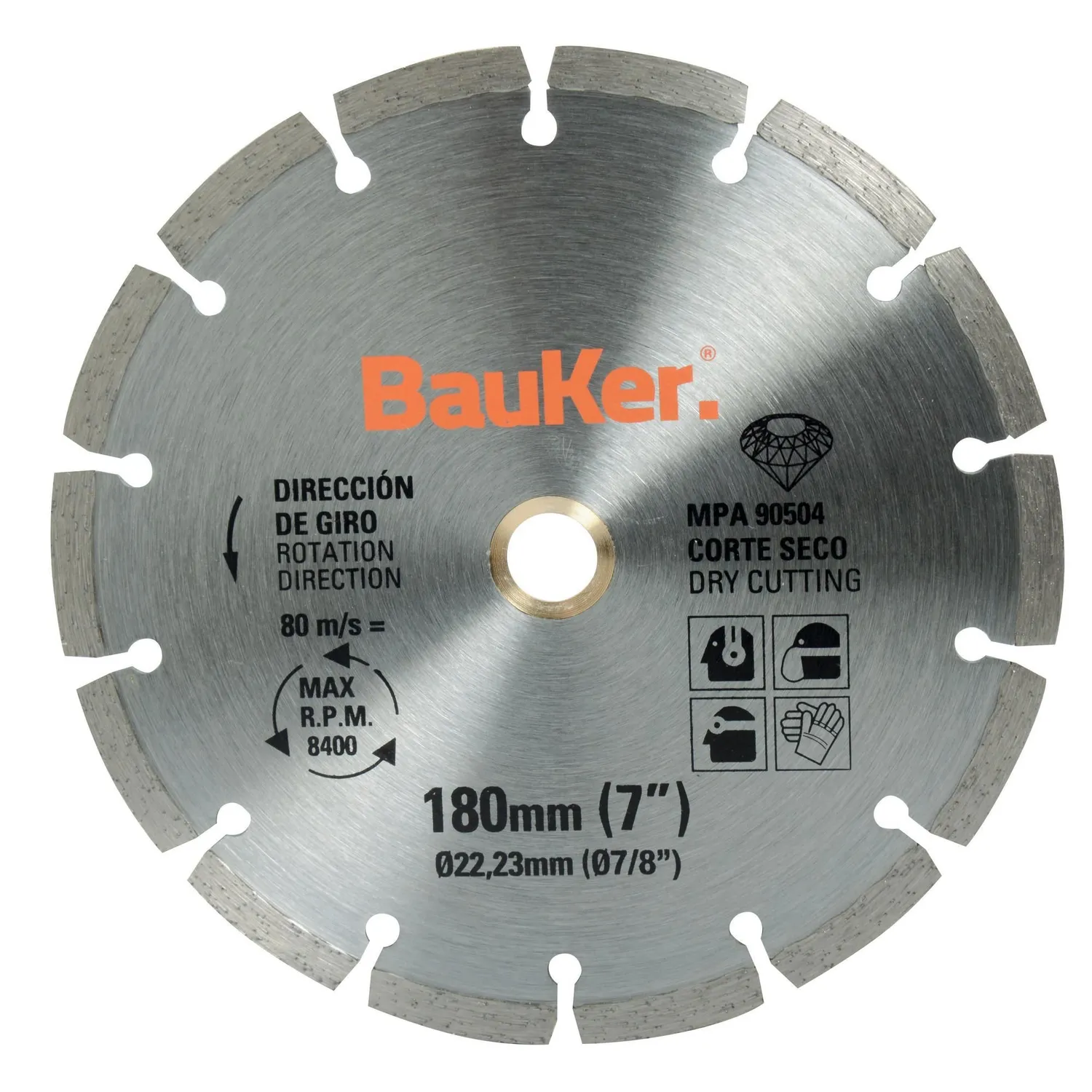 Este disco diamantado Bauker, con un diámetro de 7", es ideal para desbastar acero inoxidable, amolar cantos y superficies, enlucir y alisar, así como para desbarbar los cordones de soldadura. Su diseño segmentado es perfecto para cortar cerámica y ladrillo. Con un largo de hoja de 24 cm, este disco es una excelente opción para tus proyectos.