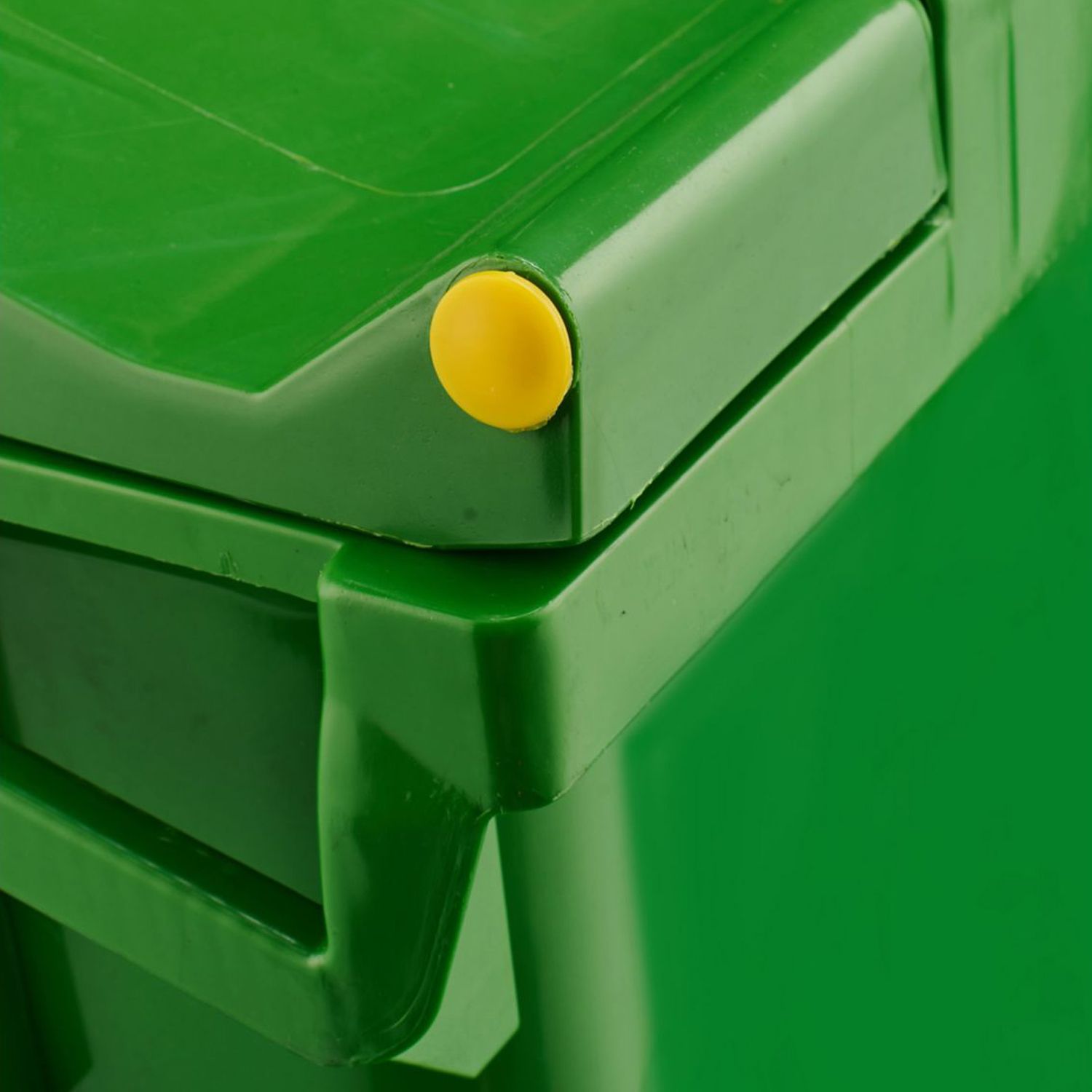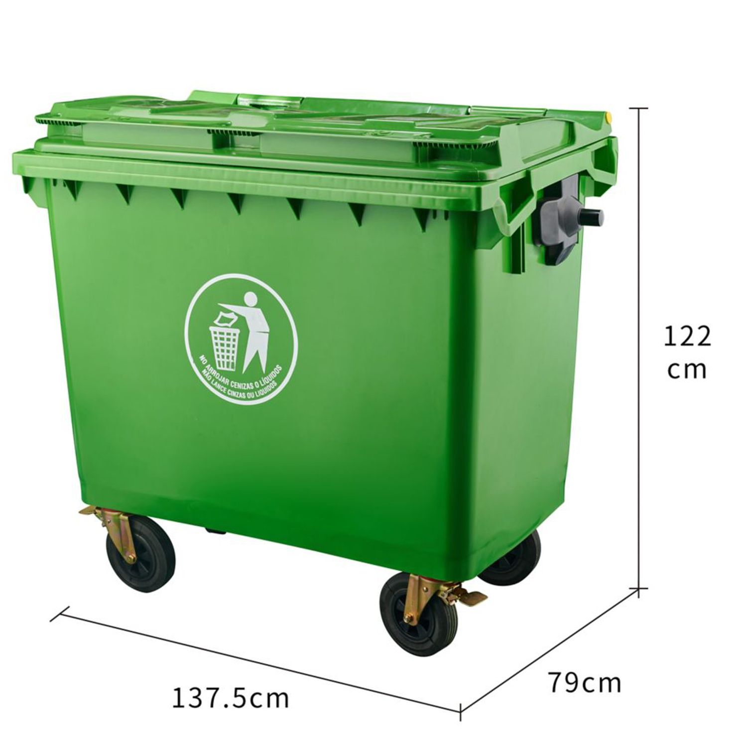 Este contenedor de basura manual, fabricado en plástico, cuenta con una capacidad volumétrica de 630 l. Sus dimensiones son: 137.5 cm de largo, 79 cm de ancho y 122 cm de alto. Además, posee ruedas y tapa para facilitar su uso y transporte. Su color es verde.