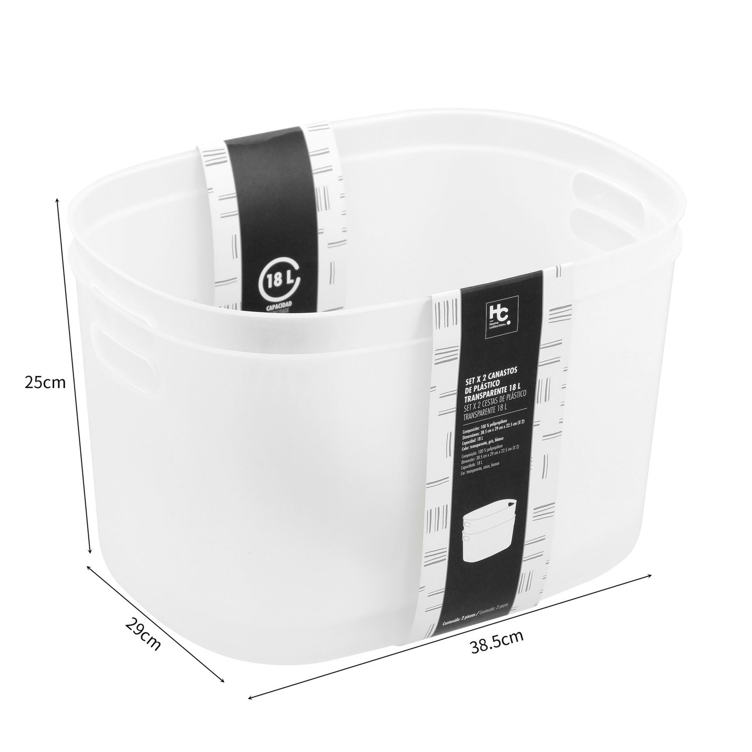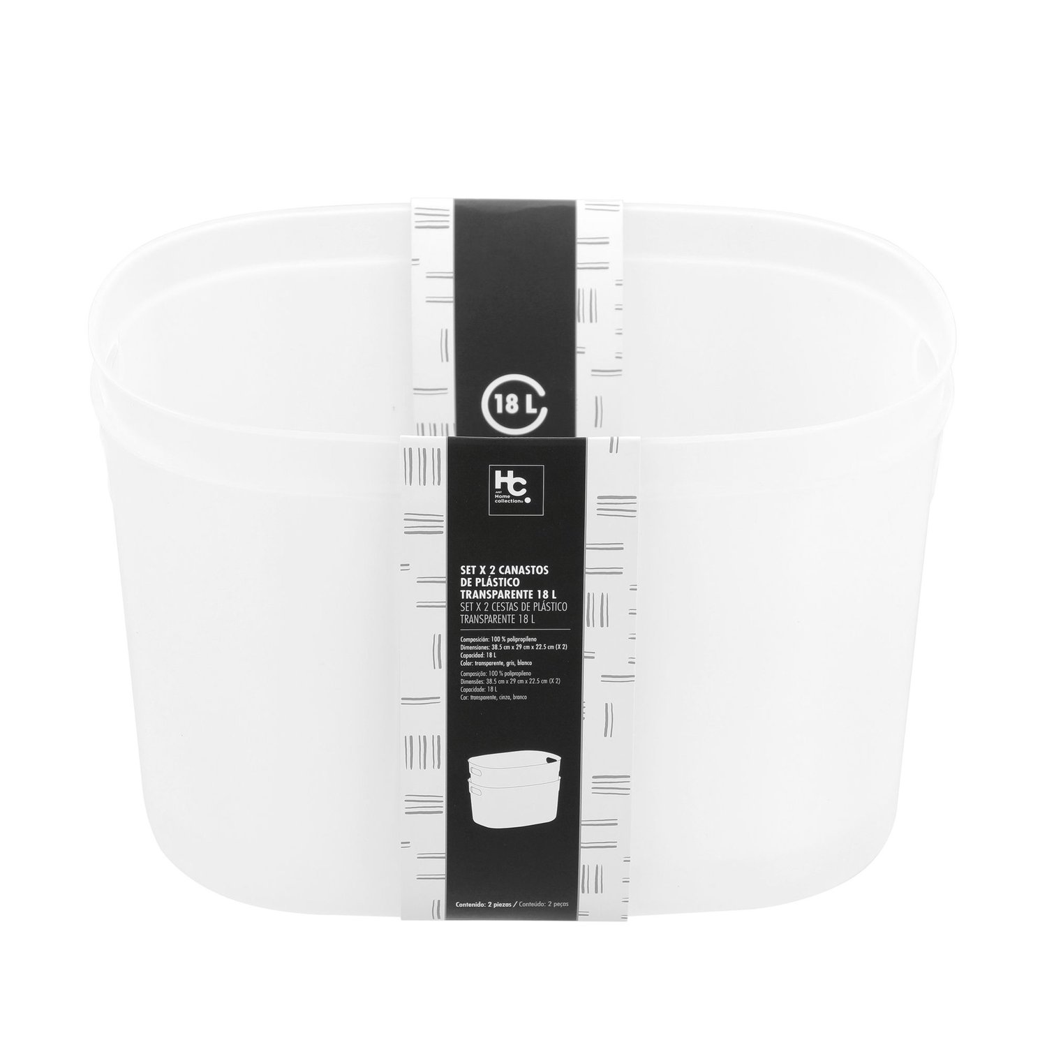 Estas canastas multiuso, con una capacidad de 18 l, son ideales para almacenar una gran variedad de objetos. Fabricadas en polipropileno 100% PP, ofrecen durabilidad y resistencia. Con un ancho de 38 cm, una profundidad de 29 cm y una altura de 22.5 cm, son perfectas para cualquier espacio. El set incluye 2 canastas de color transparente, lo que te permite ver fácilmente su contenido.