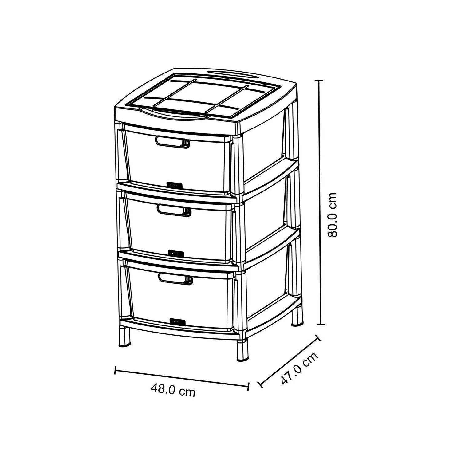 Este gavetero Rimax cuenta con 3 amplios cajones para guardar tus pertenencias, con dimensiones de 80 cm de alto, 48 cm de ancho y 47 cm de profundidad. Fabricado en plástico resistente, es una solución duradera y fácil de integrar en dormitorios, lavanderías, cocinas o baños. Su estilo nórdico y color gris lo convierten en un elemento decorativo que complementará tu hogar a la perfección.
