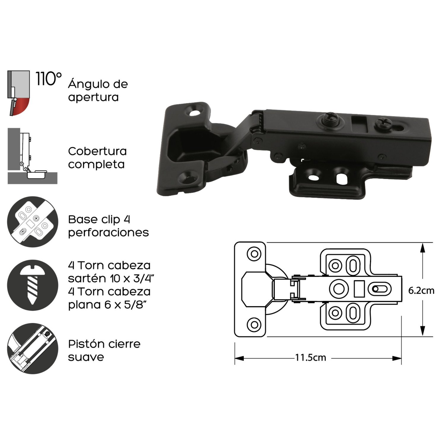 | Características | Cierre suave con clip on base 4 perforaciones con tornillos. Contiene: 100 pares |
